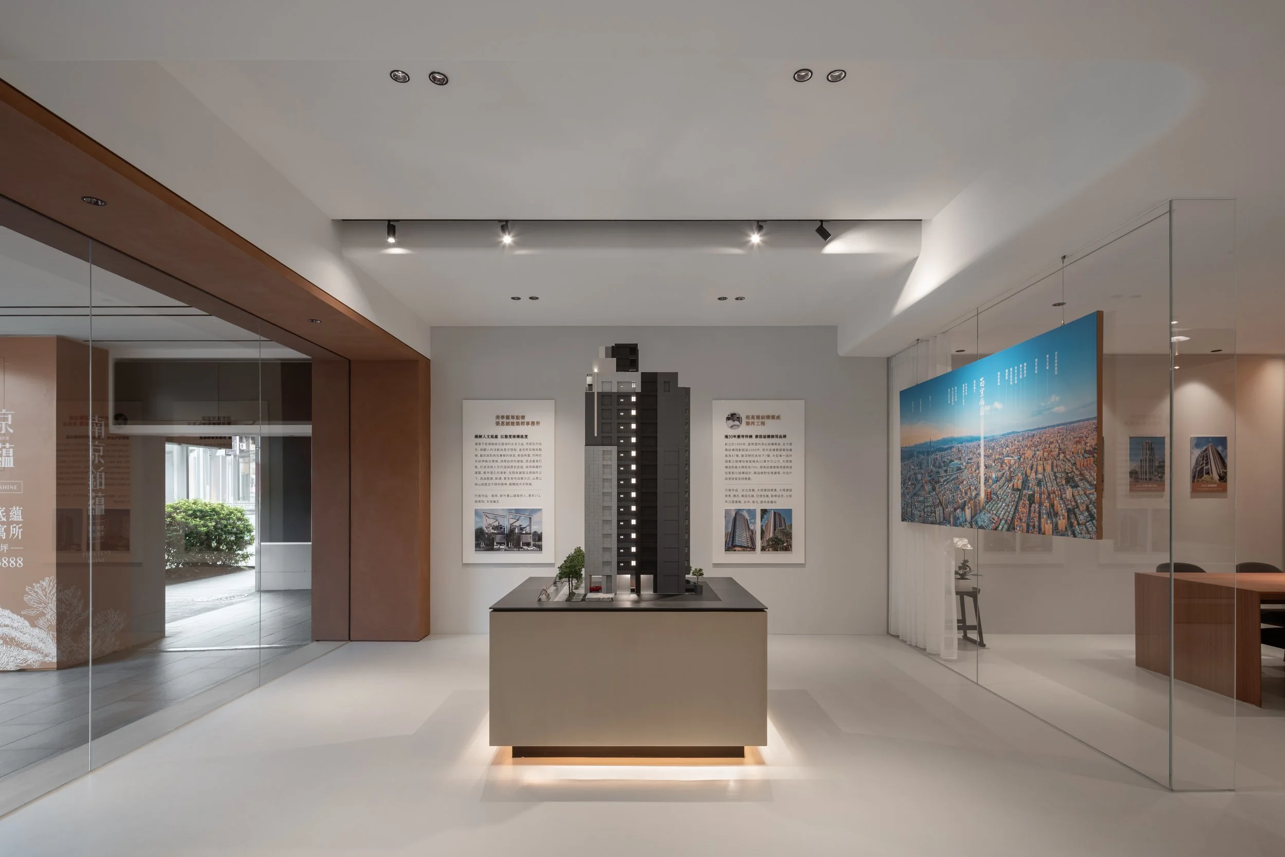 在既有的基地上利用原始空間結構將銷售空間呈現出來,並把對未來重建後的建築及室內空間做想像的延伸。